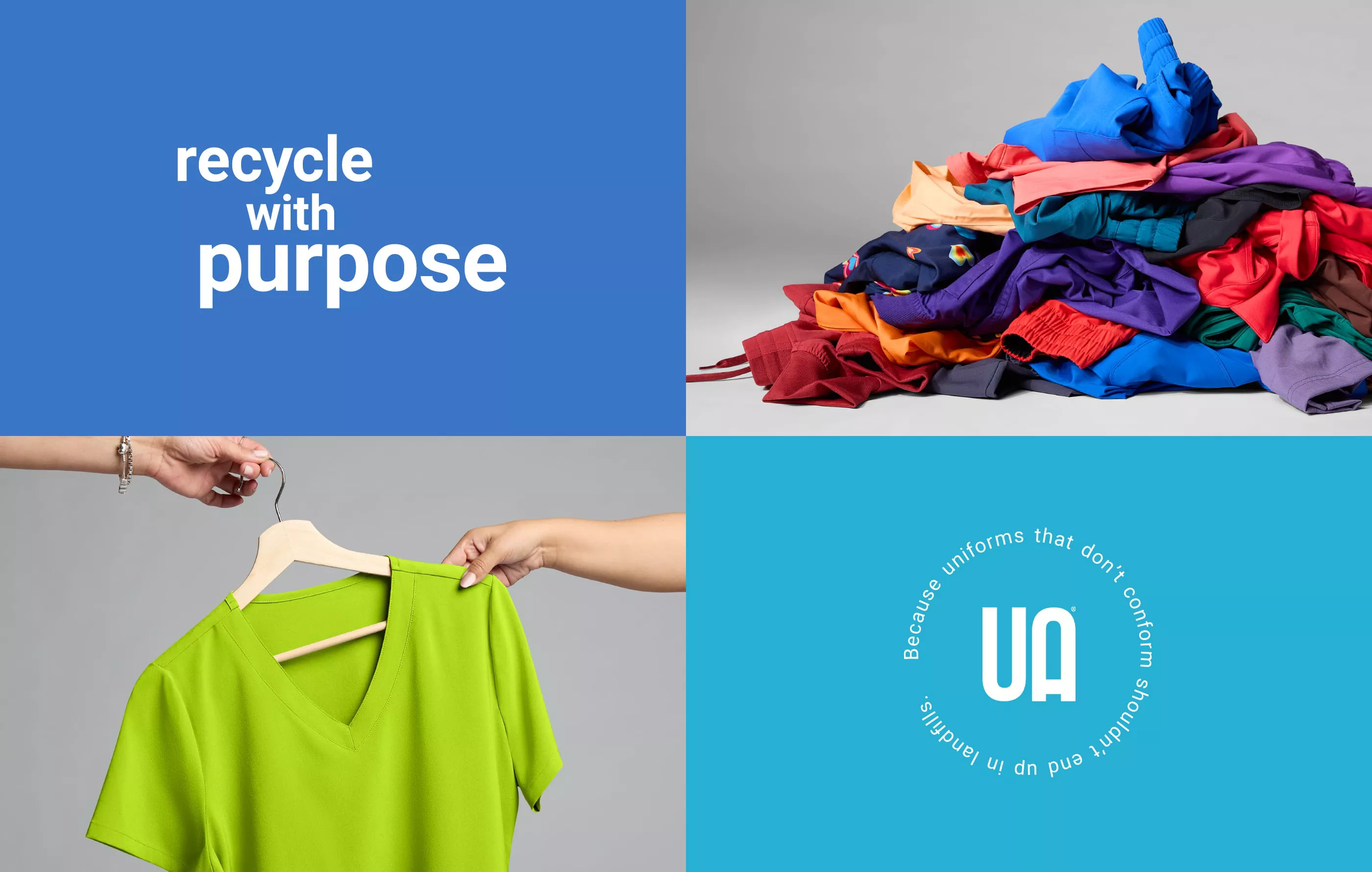 Scrubs returned through the UA Scrub Swap program are processed by our recycling partner, SuperCircle. Depending on the material, some scrubs may be fiber to fiber recycled and turned into new garments. Items that cannot be recycled this way may be repurposed through upcycling or downcycling applications such as insulation, furniture batting, rubber mats, or construction materials.