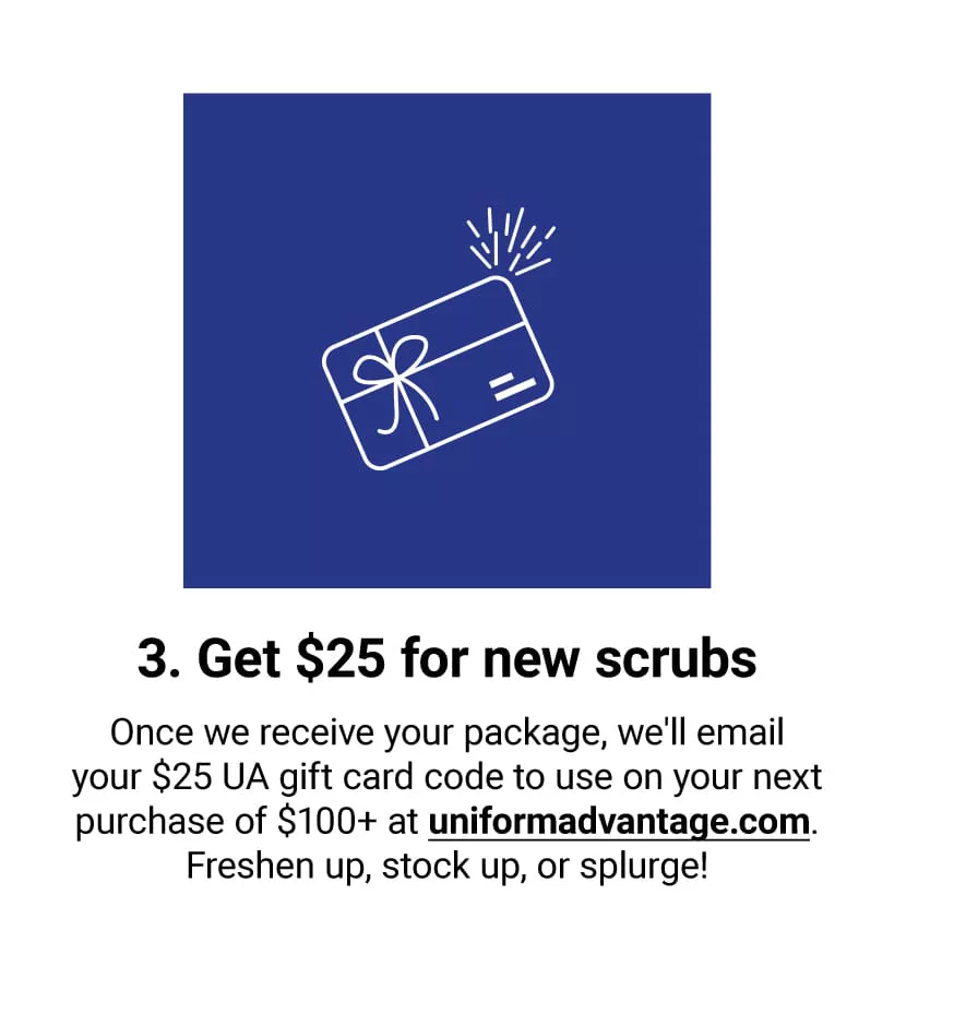 Step 3: Once your shipment is scanned by the carrier, a UA Scrub Swap eGift Card for $25 OFF your next order of $100+ will be issued via email.