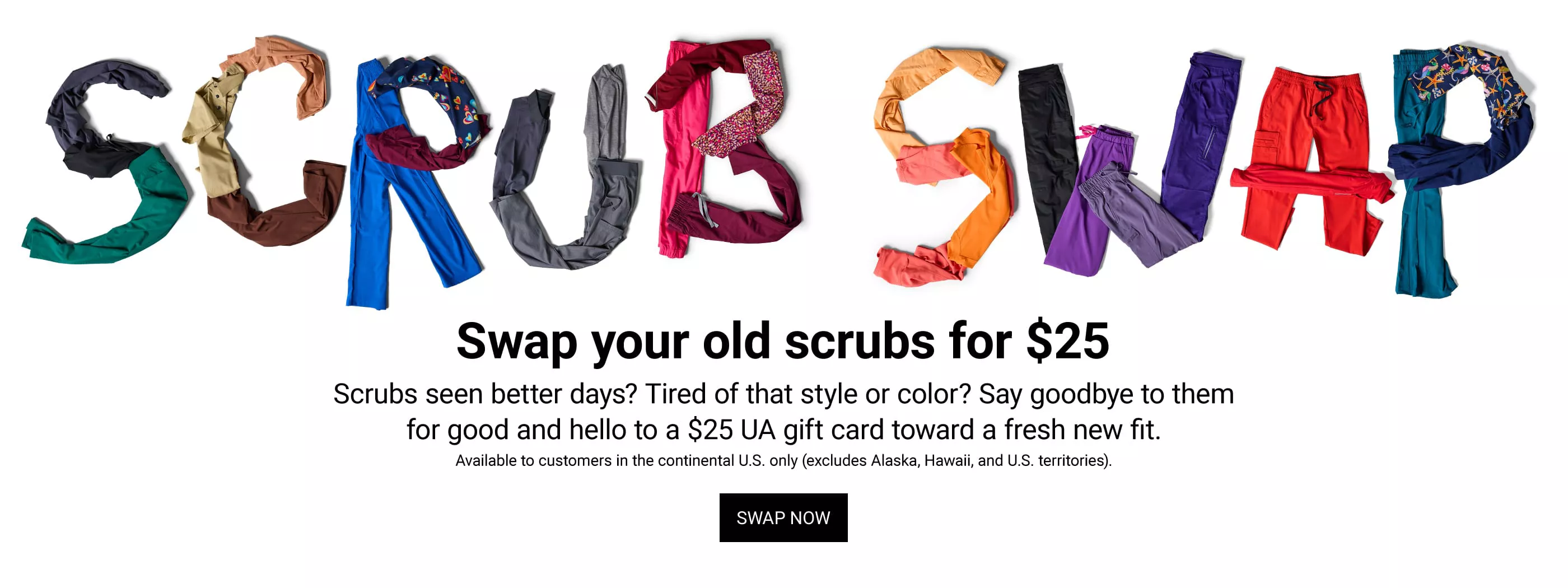 Currently, the UA Scrub Swap program is currently available only to customers located in the continental United States (excluding Alaska, Hawaii, and U.S. territories). Items must be shipped using the provided prepaid shipping label.